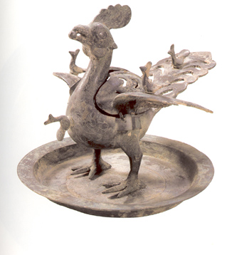 原為宮廷器具。盤為平底,三只小乳足。大鳳雙爪鉚在盤上, 首引頸,口銜圓球,振翅挺胸,闊翅上翹,胸前與雙翅上均有陰刻羽狀紋飾。翅、腹連接外用穿定連接,可自有張合。尾翅均有弧形與長方形小鏤孔。胸前、雙翅和尾部另飾四只雛鳳。
