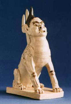 此獸人面獸身,昂首挺胸,面目猙獰,項背附戟,肩部有刻劃的花翼。通體施白釉,唯面部間繪黑彩。