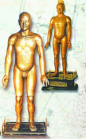 王惟一主持設(shè)計鑄造的針灸銅人,是兩座身高如同常人的裸體男像,系用精銅雕鑄而成,其工藝設(shè)計可謂精巧無比,在以后的各個朝代里,一直被人們視為“國寶”。在醫(yī)學史上,針灸銅人更是世界上最早創(chuàng)制的人體經(jīng)脈、經(jīng)穴模型,也是世界上最早的一種如實反映人體內(nèi)臟和骨骼的解剖模型。但是,宋代針灸銅人自鑄成之后,卻命運坎坷,歷經(jīng)滄桑,在封建朝代的相互更替和戰(zhàn)火混亂之中最后都下落不明。