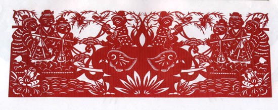 現(xiàn)在,剪紙更多地是用于裝飾。剪紙可用于點綴墻壁、門窗、房柱、鏡子、燈和燈籠等,也可為禮品作點綴之用,甚至剪紙本身也可作為禮物贈送他人。剪紙因材料單薄,也可為滿幅鋪排勻稱而物像互相串連的平面構(gòu)圖法,形象多富裝飾性,避免大聲黑白,用精致花紋點綴裝飾主體人物。平面重疊鋪陳的手法不僅造成濃烈的民族風味,并用擴大了畫面的容量,提高了剪紙的表現(xiàn)力,既增添了視覺的動感變化,又加強了形式美感。剪紙的內(nèi)容(題材)非常豐富,除了我們經(jīng)常見到的吉祥字、圖案、十二生肖、臉譜外,還有些我們平時較少見的內(nèi)容,其剪紙作品還分有單亮色、組合色、撒金彩等等;有單一題材,有成套系列,如《花鳥魚蟲》、《民族服飾》、《水滸人物》、《十二生肖》……真是琳瑯滿目。