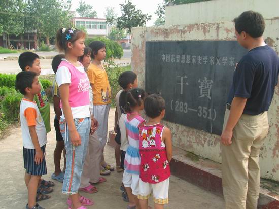 河南新蔡縣佛閣寺現(xiàn)有干寶塑像(上圖:學(xué)生接受干寶文學(xué)教育)。