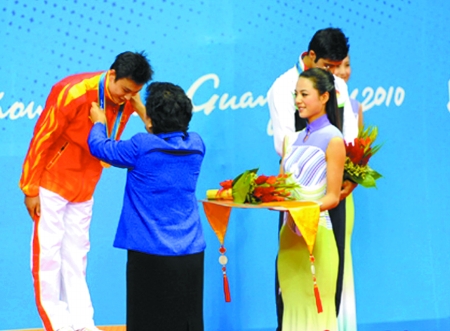 11月13日上午,在第16屆廣州亞運會首枚金牌頒獎現(xiàn)場,臺上是武術(shù)男子長拳冠軍中國選手袁曉超,而在頒獎臺下,有一位落落大方的禮儀小姐,手托金牌、鮮花站在頒獎嘉賓身旁——這位亭亭玉立、很有親和力的姑娘是咱河南的李巧娜。