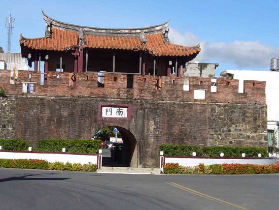 路中央,現(xiàn)已設(shè)立圓環(huán)予以保護,由于位居往來要道,可說是一般游客最熟悉的城門。城樓前方設(shè)有軒亭,其作用如一般民家前的騎樓,具防日曬雨淋之效,屬于十分罕見的設(shè)計,F(xiàn)貌為69年修葺,與原貌已有出入。