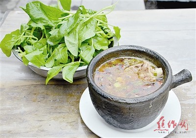 記者點(diǎn)了一份牛肉砂鍋,等了十幾分鐘,王毛平將美味的砂鍋端了出來。濃郁的湯中放有金針菇、腐竹等,覆蓋上剛炸好的鮮紅辣椒油,顏色艷麗,香氣撲鼻,立刻就勾起了記者的食欲。在砂鍋旁,放著一盤菠菜,記者用筷子夾起菠菜放入剛出爐的砂鍋中,頓時(shí)聽到菜入熱湯中咝咝的響聲。“菠菜一燙就能吃了。”王毛平熱情地提醒。記者又要了一份米搭配著吃,非常美味。