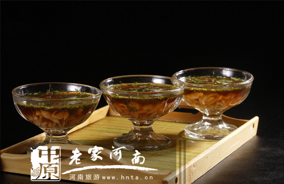 面魚兒是開封夏季常見的一種面食,吃到嘴里,滑溜溜的。芡粉糊里加入蔬菜汁或水果汁調(diào)味上色,再放上點(diǎn)醋,蒜汁,芝麻醬,撒上韭菜和芝麻,一碗清爽利口的酸辣面魚兒就可以上桌了,據(jù)說清涼的感覺會(huì)瞬間傳遍全身。