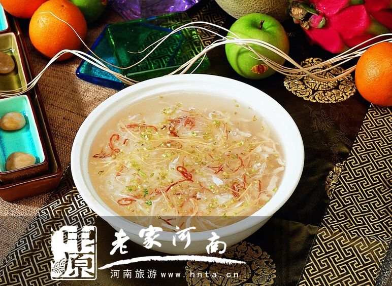 宋嫂魚羹是將主料鱖魚蒸熟剔去皮骨,加上火腿絲、香菇竹筍末及雞湯等佐料烹制而成。因魚羹鮮嫩潤(rùn)滑,味似蟹羹,故又稱“賽蟹羹”。