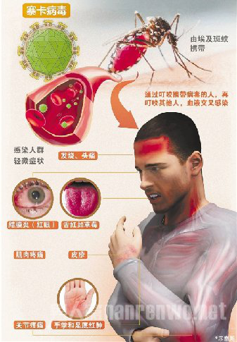 寨卡病毒病的潛伏期目前尚不清楚,現(xiàn)有資料顯示為3~12天。人感染寨卡病毒后,僅20%的人出現(xiàn)癥狀,且癥狀較輕,主要表現(xiàn)為發(fā)熱(多為中低度發(fā)熱)、皮疹(多為斑丘疹),并可伴有非化膿性結(jié)膜炎、肌肉和關(guān)節(jié)痛、全身乏力以及頭痛,少數(shù)患者可出現(xiàn)腹痛、惡心、腹瀉、粘膜潰瘍、皮膚瘙癢等。癥狀持續(xù)2~7天緩解,愈后良好,重癥與死亡病例罕見。眼下,醫(yī)學(xué)界并沒有針對寨卡病毒的疫苗和有效療法。
