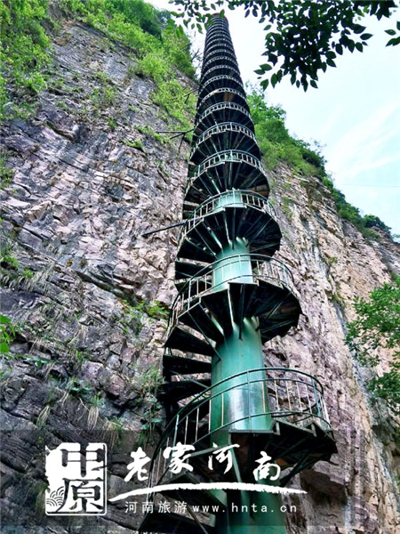 遠遠眺望,一面山壁上有“之”字行的懸空棧道,這個更刺激啊!不巧,這棧道封閉檢修,這次是上不去了。