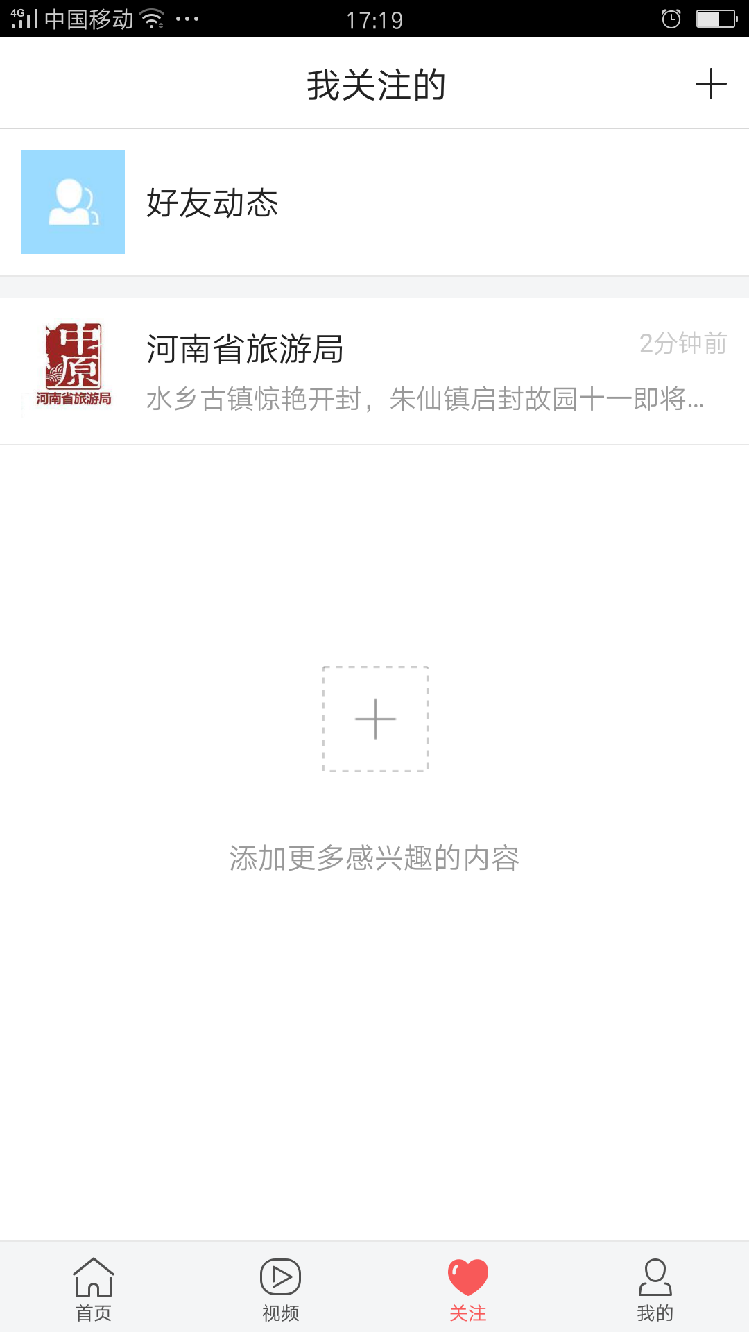 第三步:關(guān)注以后,在下方看到“首頁”“視頻”“關(guān)注”“我的”四個(gè)按鈕,點(diǎn)擊“關(guān)注”,就能看到河南省旅游局頭條號(hào),每日可快速瀏覽分享關(guān)注的頭條號(hào)新聞更新,如下: