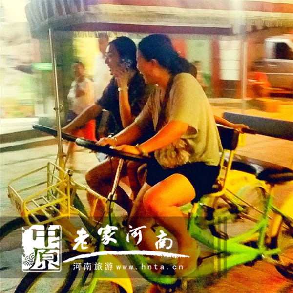 兩位美女騎著雙人腳踏車,觀景又健身,挺好玩的。