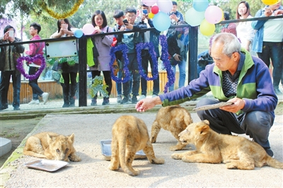 10月21日,輝縣市五龍山響水河鄉(xiāng)村旅游區(qū)內(nèi)的野生動物王國游人如織,五胞胎幼獅過“百日”的場面吸引了許多游客前來觀看。