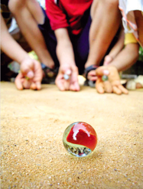 二是對“局”,此玩法最適合多人來玩。玩前,先找個地方畫一個“鍋”,一條橫線叫“杠”。開始前,每人各對彈子一個,按一定距離橫排進放“鍋”里,然后大家站到“鍋”前,向“杠”投擲彈子,叫“柄杠”,以母彈子離“杠”遠近決定先后順序。第一名開始,要從“杠”上用手彈將母彈擊向“鍋”里的彈子,若能將其擊出“鍋”外,不僅擊出的彈子暫時歸己有,而且還可以連擊。若擊不中,暫停,俟第二名、第三名……直至本輪輪完后再依次擊。