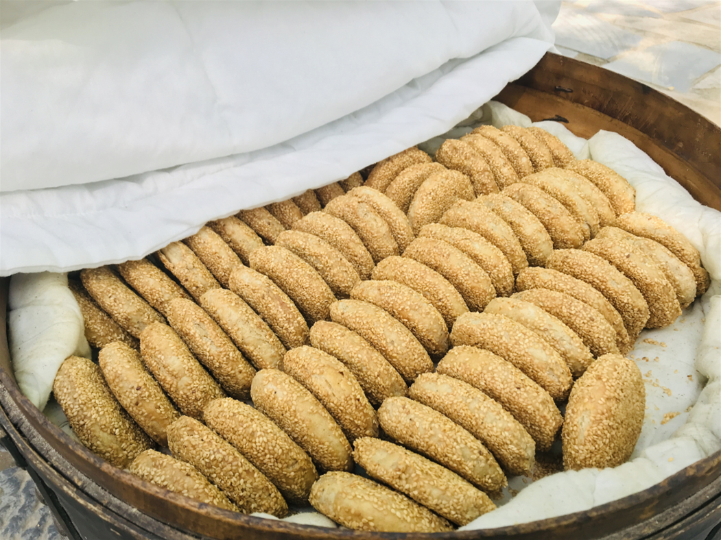 千層炊餅,酥到掉渣!有咸甜兩種選擇,咸口的是芝麻花生五香餡,甜口的是秘制紅豆。