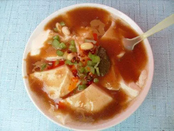 熱豆腐是鄢陵縣的傳統(tǒng)特色小吃。用50公分見(jiàn)方的木斗子,將點(diǎn)好的豆腐腦用布單稍微一攬,使豆腐成塊,軟硬度以手托起不爛為準(zhǔn)。售時(shí)用割豆腐刀將豆腐劃成菱形小塊兒放在豆腐皮上,澆上麻油、辣椒醬,用豆腐皮包起放在盤(pán)子里。熱豆腐入口即化、鮮嫩可口,別有一番風(fēng)味。