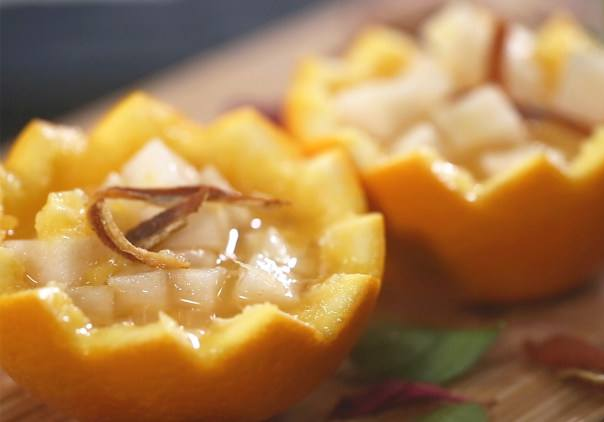 《山家清供》中記載:“雪梨大者,去皮核,切如骰子大。后用大黃熟香橙,去核,搗爛,加鹽少許,同醋、醬拌勻,可佐酒興。”即選用大個(gè)雪梨削皮去核,切成骰子大小。然后用色澤黃亮成熟的香橙,去核搗爛,加一點(diǎn)鹽,和醋、醬油一起拌勻。雪梨甘甜,香橙多汁,二者同食不僅味道清爽,還兼有醒酒的功效。