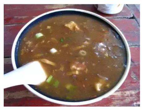 評語:羊肉湯的關鍵,其實也是幾乎所有湯的關鍵,一是熬湯要舍得花時間,二是要舍得放佐料,湯鍋里都有一個小孩兒枕頭般大小的佐料袋,里面據(jù)說放有花椒、八角、肉桂、草果之類。三是開始就是切記要把水添夠,不能兌水(不然湯可就失去它的奧妙啦),也就是老喝家所說的“原湯”,這也是湯行業(yè)中的行規(guī)。