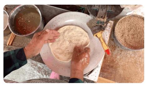 貼爐前的最后一道工序,將餅團(tuán)攤開,一面刷糖,抹上白芝麻。還記得小時候的你,只吃糖面和餅芯,讓爸爸媽媽吃硬硬的餅皮嗎?