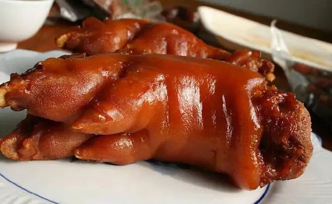 王洛紅燒豬蹄成品呈醬紅色,晶瑩發(fā)亮,爛而不散,肥而不膩,濃香可口,味美異常。