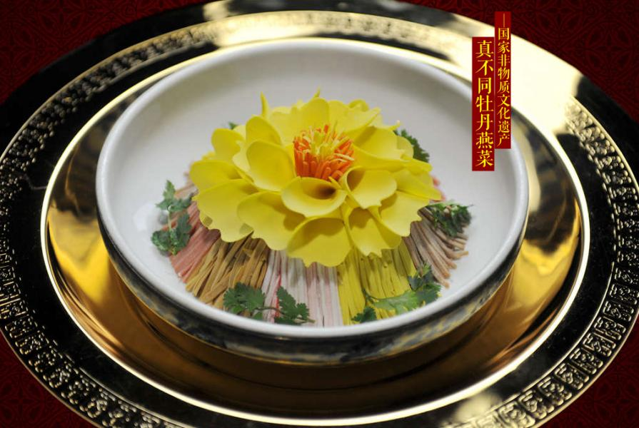 牡丹燕菜,說(shuō)到水席必及燕菜,它是水席中的第一道大菜,得譽(yù)于大周皇帝武則天。相傳,武媚娘在做才人時(shí),曾飲鴆酒而被蘿卜解毒復(fù)活,在位居皇后時(shí),即恩拜蘿卜為“義菜”。在她君臨天下時(shí)期,有一菜農(nóng)敬獻(xiàn)上一個(gè)奇特大蘿卜,武皇命御廚做菜,御廚們將蘿卜配以山珍海味,制成湯羹奉獻(xiàn)給武皇,武皇聞香品嘗頓感有燕窩之味,遂賜名“賽燕窩”,因起源于洛陽(yáng),故稱之為洛陽(yáng)燕菜,后更名為牡丹燕菜。