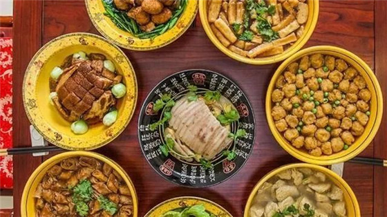 傳統(tǒng)的?h八大碗由八道菜組成,包括四葷四素,四葷以豬肉為主,精選肘子肉,后臀肉,分為腐乳肉、小酥肉、扣肉、方肉;四素以皮渣、海帶、粉條、豆腐為主,經(jīng)過獨特的工藝制作而成??h八大碗的制作比較講究,要求多以“水席”為主,即湯多肉少。