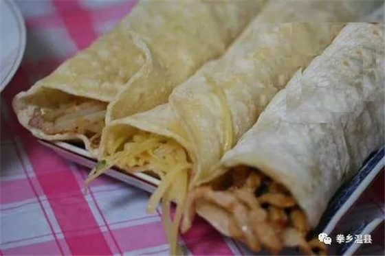 第七:薄烙饃卷菜。單張面餅,卷菜食之。食法同東北春餅,但,ra東北春餅是發(fā)面,咱溫縣薄烙饃是實(shí)面。