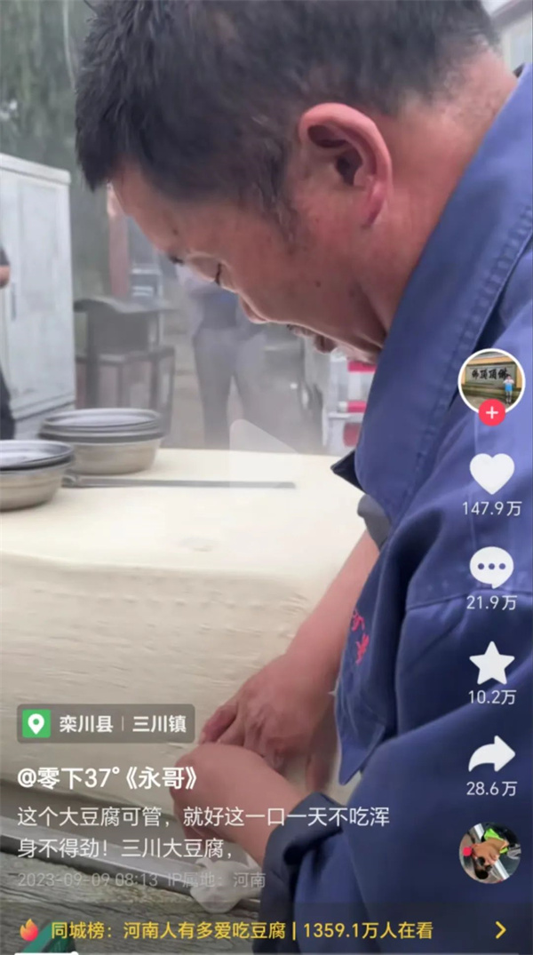 最近欒川縣的三川豆腐成了全國(guó)熱點(diǎn),抖音點(diǎn)贊量破了百萬(wàn),小城街頭巷尾議論的話題都是,“哎,最近去三川吃豆腐了沒(méi)?”