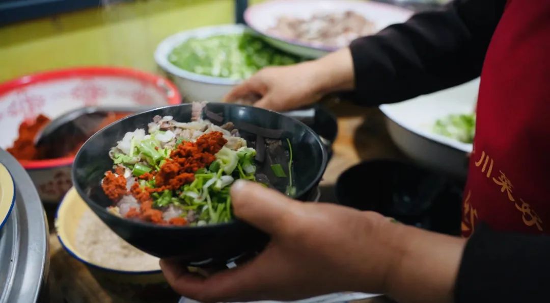 趙家羊湯館已經(jīng)在鎮(zhèn)上開了四十年,每天早上七點起來開始分割羊肉放入大桶中燉制三小時以上,這樣羊骨頭里的骨髓、膠原體等就都熬到了湯里。煮肉的火候也有講究,時間長了,切不成薄片,時間短了,不入味,這完全靠的是他們四十年的經(jīng)驗,對時間的掌控力。