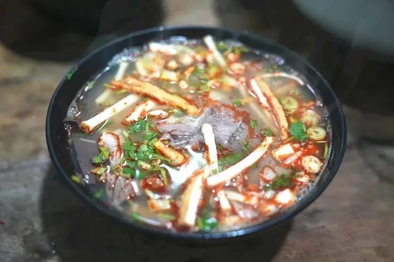 當一大鍋肉湯煮好后,將提前準備好的蔥花、香菜、油豆腐條等佐料和肉片放入碗中,用煮沸的湯水進行“燙涮”后,注入飛滾的沸湯,香氣撲鼻,切成的塊狀的火燒饃泡入湯中,勁道的油饃越泡越軟,肉湯的味道滲入餅中,入嘴即化,滿口清香,回味無窮,越嚼越“美”,滿足之感油然而生。