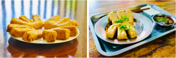 三川豆腐在勤勞的三川人民手中巧妙變幻成各種美味,于是一道道豆腐特色佳肴出現(xiàn)在我們面前。佛手豆腐,又稱“三條腿”豆腐,屬于豆腐的再制作。前期和豆腐制作工序一樣,豆腐制成后,再經(jīng)過晾曬、制型,成型的豆腐干經(jīng)8小時的晾曬后切制成三條腿形狀,最后進行油炸:將純植物油燒至40度,放入豆腐干,慢慢炸至發(fā)虛、焦黃后撈出,瀝干。十里八村只有每逢街上趕集的時候,才能嘗到這個美味。