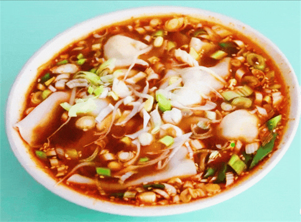 葉子扁食是當?shù)胤浅3雒囊坏烂朗常?strong>扁食皮,形似餛飩皮,但勁道厚實,豆腐、雞蛋、韭菜等調餡包成餛飩狀,碗里用芝麻、辣椒、陳醋等調味沖制。