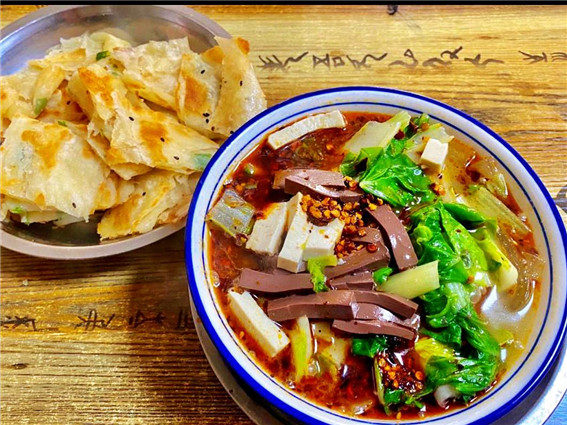 扁粉菜以豬血、豆腐、青菜、粉條為主材,其做法與燴菜類似,主要區(qū)別是用高湯燉制,辣椒是扁粉菜的靈魂,當地人吃扁粉菜的時候基本上都會放上兩勺辣椒,翠綠的白菜,嫩滑的豆腐、豬血,晶瑩剔透的紅薯粉條,每一口都是驚喜,當地人喜歡搭配油餅吃,一碗扁粉菜、兩塊錢油餅,就能吃得飽飽的,而且很多飯館還可以免費續(xù)碗。