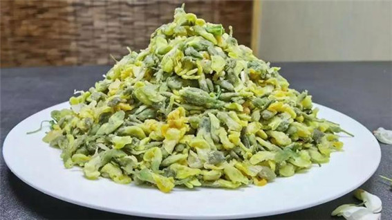 除了蒸槐花外,還有槐花包子、醋熘槐花、槐花炒雞蛋等吃法。若說最美味的,還得是槐花炒雞蛋,將雞蛋倒油鍋里,翻炒后蛋花膨脹成云朵狀,這時(shí)再加入槐花,槐花迅速脫水與雞蛋融為一體,吃到嘴里,槐花化解了雞蛋的油膩,平添了幾分清甜。