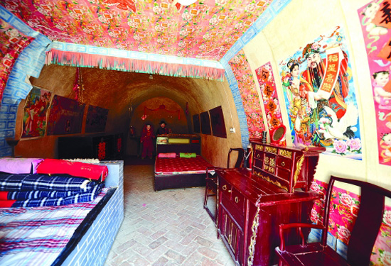 陜縣天井窯院整體造型美觀,居住舒適愜意,文化內(nèi)涵豐富,已成為當(dāng)?shù)匾豁?xiàng)體現(xiàn)民風(fēng)民俗的旅游產(chǎn)業(yè)。圖為陜縣西張村鎮(zhèn)廟上村經(jīng)過裝飾的天井窯院新婚洞房,吸引了眾多游客的眼球。