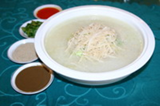 燴三袋亦稱“燴散丹”,為清真宴席中的上等湯菜。此菜選料嚴(yán)格,制作考究,風(fēng)味獨(dú)特,深受食客青睞。用牛之熟制后的三袋、百葉、花肚切片、切塊,用白湯下鍋,武火餷制到湯汁濃白即成,上桌時外帶芝麻醬、辣椒油、香菜調(diào)味,是口感極醇厚之湯菜。