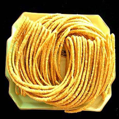 馓子,是我國一種古老的食品。以糯米粉或是面粉搓成細(xì)繩,挽曲如環(huán),入油鍋炸成金黃色,香酥無比,為南北之通食!睹x考》云:“繩而食之,曰環(huán)餅,又曰寒具,即今馓子。”俗語有"點(diǎn)心香,月餅美,回回的馓子甜又脆"一說。
