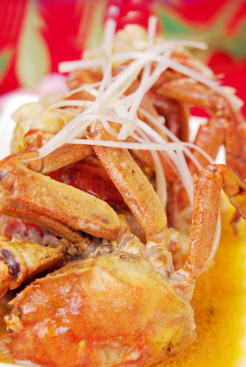 “九月團(tuán)臍十月尖,持螯飲酒菊花天。”每當(dāng)?shù)す痫h香、金風(fēng)送爽時(shí)正值蟹肥菊黃。此菜系將中等河蟹切成兩半,油煎后加調(diào)料燜燒而成。成菜后,色澤鮮紅、肉質(zhì)鮮嫩。