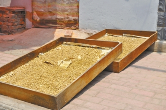 捂好的黃豆已經(jīng)在太陽(yáng)下面暴曬了三四天,為的是不讓黃豆帶濕氣,以免豆什兒發(fā)霉。帖文霞把黃豆平均分成四份,分別放入四個(gè)瓷盆當(dāng)中。“瓷盆薄,曬得透。有的家里用瓦盆,都可以的。”