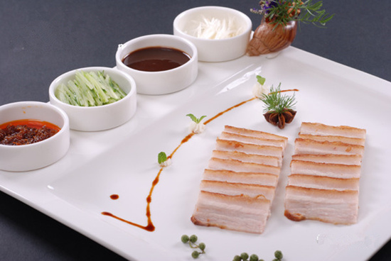 炸紫酥肉又名賽烤鴨,是一道由北宋皇宮紫禁城中傳到民間的菜品,加之配料中有紫蘇葉,故名紫酥肉。烹制此饌工藝繁多復(fù)雜,須將五花豬肉經(jīng)浸煮、壓平、片皮、腌味、蒸制等工序后,再置熱油中炸45分鐘,炸制時須反復(fù)多次涂抹調(diào)料和香醋方能制成。成品色澤金紅,皮質(zhì)酥脆,食用時以蔥白、甜醬佐味,用薄餅(或荷葉夾)卷而食之,酥香脆美,肥而不膩,似烤鴨而勝烤鴨,味過之而無不及。倘若單取肉沾醬而食,風(fēng)味尤佳,會讓你立即印證古人所云:色類真金、狀若凌雪,入口即化的絕佳滋味,充盈口腔,真正領(lǐng)略到味的美妙與快感。
