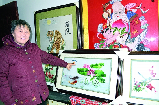 李雪層今年75歲,家里有一間屋子擺放的全是她的刺繡作品。五子拜壽、紫氣東來(lái)、魚戲蓮等一幅幅栩栩如生的作品令人眼花繚亂,嘆為觀止。“我只要一開始扎花,頭疼腦悶什么的,毛病都沒了。”李雪層笑著告訴記者。對(duì)刺繡技藝的熱愛促使她在古稀之年仍堅(jiān)持創(chuàng)作,有一天凌晨?jī)牲c(diǎn),她睡著睡著突然有了一個(gè)想法,立馬兒爬起來(lái)開始扎花。