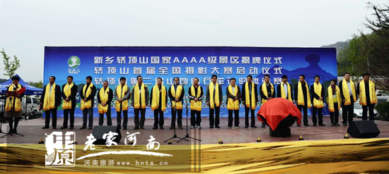 河南省旅游局局長寇武江和新鄉(xiāng)市政府副市長職偉共同為轎頂山國家4A級(jí)旅游景區(qū)揭牌