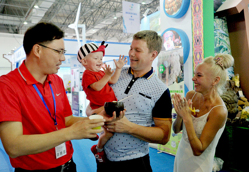 來自俄羅斯的一家人在國際旅游島展區(qū)品嘗海南椰子食品