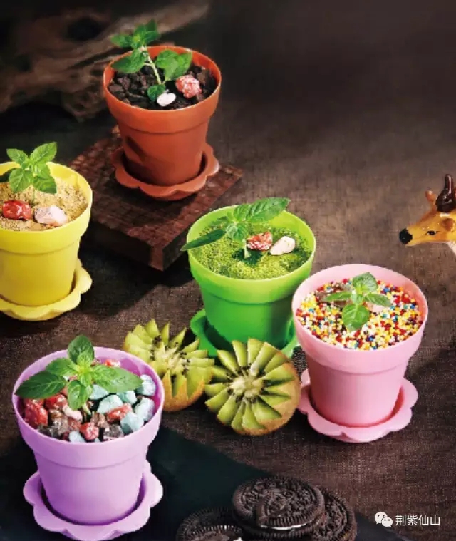 用樸實的容器裝上土一般的餅干,佐以冰淇淋清涼口感,最后用植物點綴,還原盆栽意境,像真的一樣。用心將原本距離感的靜態(tài)植物,變成可口的吃食!
