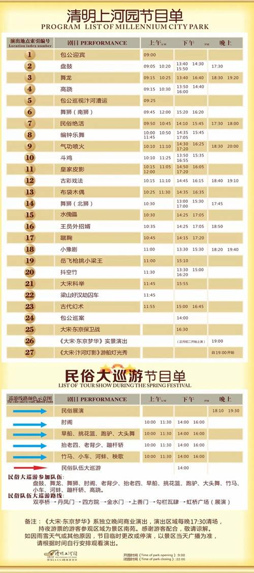 春節(jié)期間,氣溫回升,除了白天演藝及民俗演出外,恢復(fù)了三場大型實(shí)景演出,即《大宋·東京保衛(wèi)戰(zhàn)》、《大宋·汴河燈影》以及賀歲版《大宋·東京夢華》。