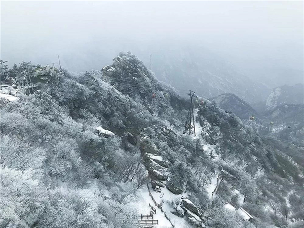 山上——玉樹瓊枝。由于山頂?shù)蜏赜绊懀袢蘸0蝺汕Ф嗝椎睦暇皆俅谓笛,山頂銀裝素裹、玉樹瓊枝,石林與霧凇、冰凌、冰掛等交相輝映,晶瑩剔透,宛若一幅水墨畫。