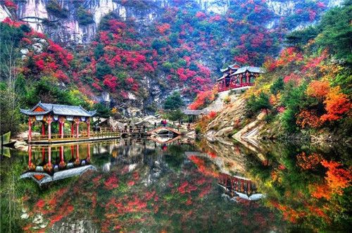 秋天的臥龍谷可稱得上是“漫江碧透,層林盡染”,這漫山繽紛的顏色,倒映在平靜的湖面上,讓湖水也沾染了幾分秋色。
