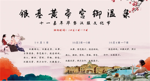 據(jù)悉,銀基黃帝宮御溫泉為迎接國慶節(jié),10月1日—7日重磅推出“漢服文化節(jié)”等眾多特色又好玩的活動。銀基黃帝宮御溫泉位于銀基國際旅游度假區(qū)內(nèi),是按星級標(biāo)準(zhǔn)打造的一座集溫泉養(yǎng)生、住宿休閑、娛樂餐飲于一體的綜合性溫泉度假酒店。自成立以來,它已成為眾多商務(wù)人群放松身心、洽談業(yè)務(wù),親子家庭假期歡聚、游玩休假,中老年人健康養(yǎng)生、頤養(yǎng)天年的首選之所。