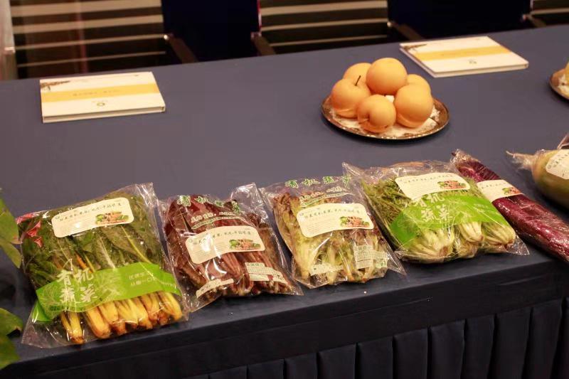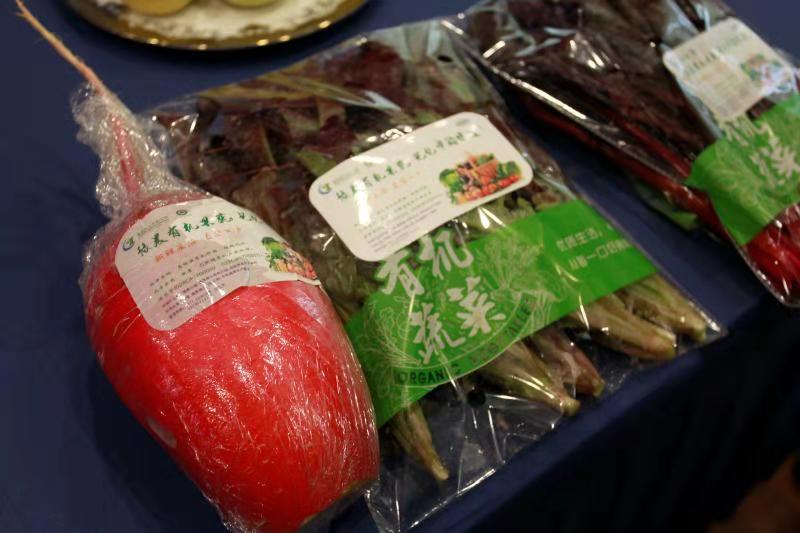 現(xiàn)場從豫晨有機蔬菜基地新鮮采摘的各色水果與有機蔬菜,品類繁多,引入注目。
