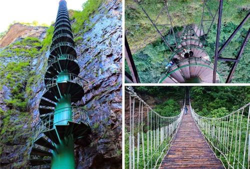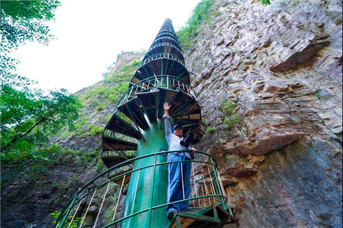 亞洲最高的摩天筒梯位于王相巖景區(qū)內(nèi),是一個呈螺旋狀扶搖直上的鋼結(jié)構(gòu)筒梯,梯高88米,直徑3米,臺階有331步,螺絲一般直插云霄。在中國僅此一處,因此又有著“華夏第一筒梯”之稱!