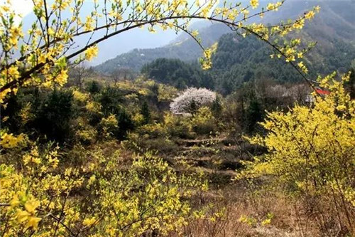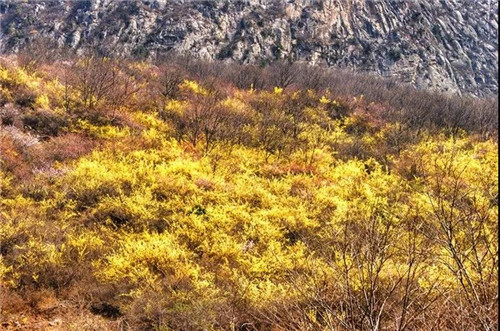 三月下旬,花期一到,競相開放的連翹花把關(guān)山裝扮成金色的海洋。