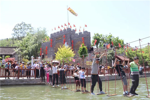 在傳統(tǒng)古村落趙莊,來自各地的游客朋友們漫步特色小吃街,打卡網(wǎng)紅晃晃橋、空中索橋、懸崖秋千、水上漫步等特色游樂項目,徒步穿越地谷嶺、朝歌寨,徜徉青山綠水間,感受戶外登山的無限樂趣。